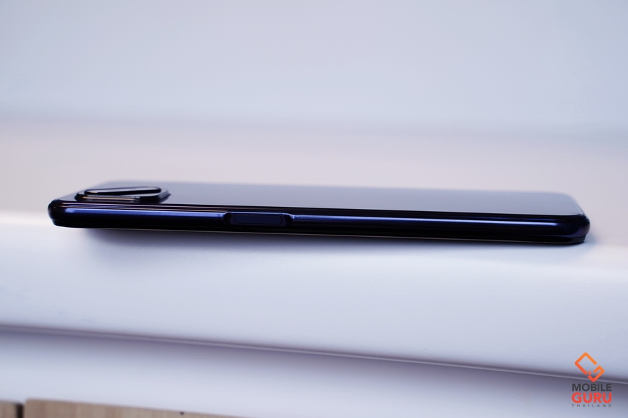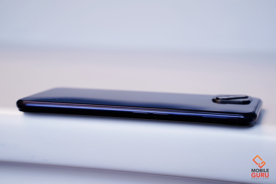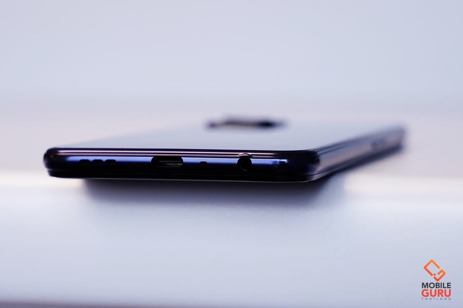ด้านขวามีปุ่ม Power ที่ทำหน้าที่เป็นเซ็นเซอร์สแกนลายนิ้วมือ ช่วยให้ปลดล็อกหน้าจอได้ด้วยมือข้างเดียวอย่างสะดวกสบาย และไม่จำเป็นต้องออกแรงกด เพียงแค่แตะก็สามารถปลดล็อกได้แล้วครับ ส่วนด้านซ้ายจะมีปุ่มปรับระดับเสียง ด้านบนมีไมค์ตัดเสียงรบกวน และด้านล่างมีพอร์ทหูฟัง 3.5 มม. ไมโครโฟน USB Type-C และลำโพง เสียงดังและมีมิติ