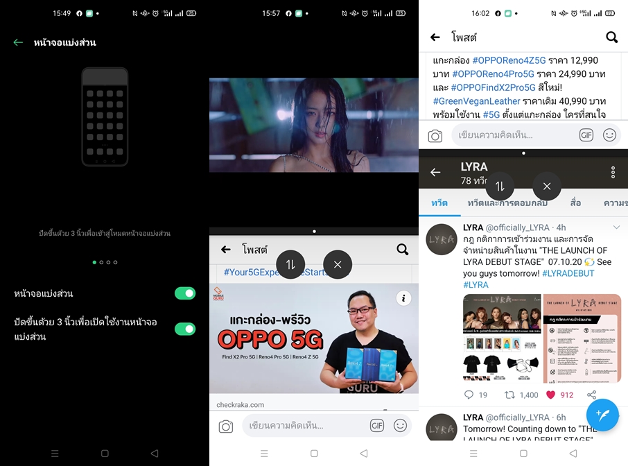 App Split-Screen เป็นการแบ่งหน้าจอเป็น 2 ส่วน สามารถใช้งานแอปพลิเคชัน ที่แตกต่างได้พร้อมกันในหน้าจอเดียว สามารถเลือกใช้งานได้หลากหลายรูปแบบ ไม่ว่าจะเป็นการใช้ 3 นิ้ว การลากหน้าจอขึ้นเพื่อแบ่งหน้าจอ หรือไปที่ Recent App แล้วเลือกเครื่องหมายขีด 3 ขีดด้านขวา แล้วเลือกคำสั่งแบ่งหน้าจอ