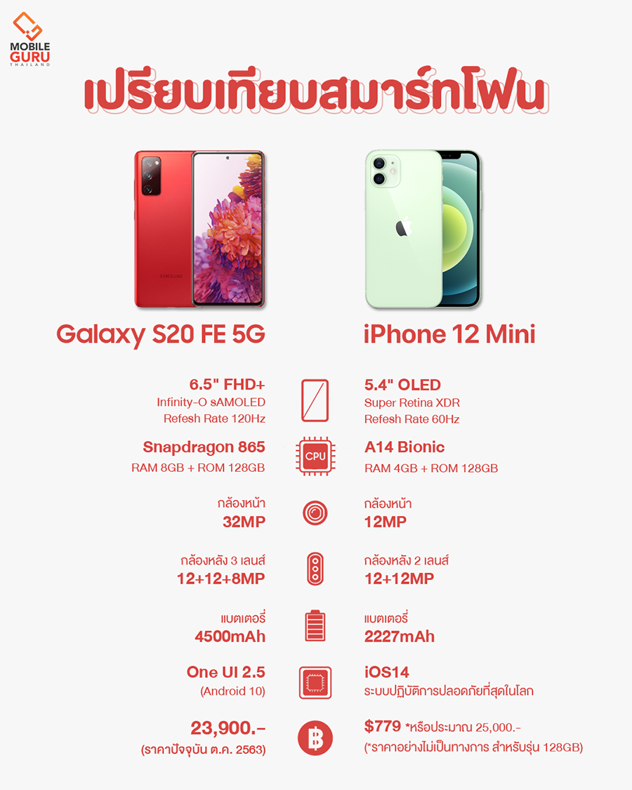 เปรียบเทียบสเปกของทั้งสองรุ่น Samsung Galaxy S20 FE 5G และ iPhone 12 Mini