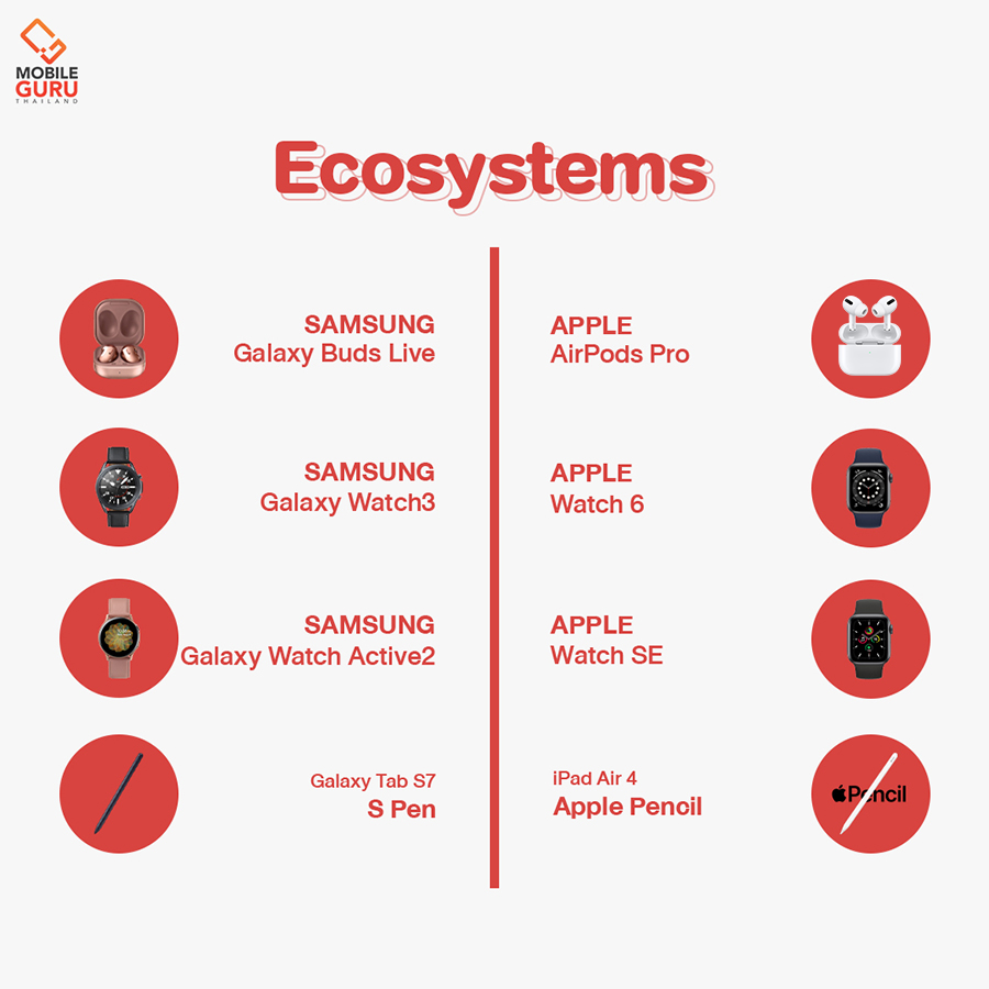 มาต่อกันระบบนิเวศน์หรือทื่หลายมักได้ยินกันคุ้นหูว่า Ecosystem เป็นหนึ่งในอาณาจักรสินค้าของแต่ละแบรนด์ที่จะเข้าเพิ่มประสบการณ์การใช้งานสมาร์ทโฟนให้ไร้รอยต่อมากขึ้น ซึ่งในปัจจุบันทั้ง ซัมซุง และ Apple ต่างก็เป็นเจ้าพ่อระบบนิเวศน์ด้วยกันทั้งคู่ และทั้งสองฝั่งก็ต่างมีสินค้าในไลน์อัพที่ไม่แพ้กันด้วยนะครับ สามารถชมภาพเปรียบเทียบด้านล่างได้เลย