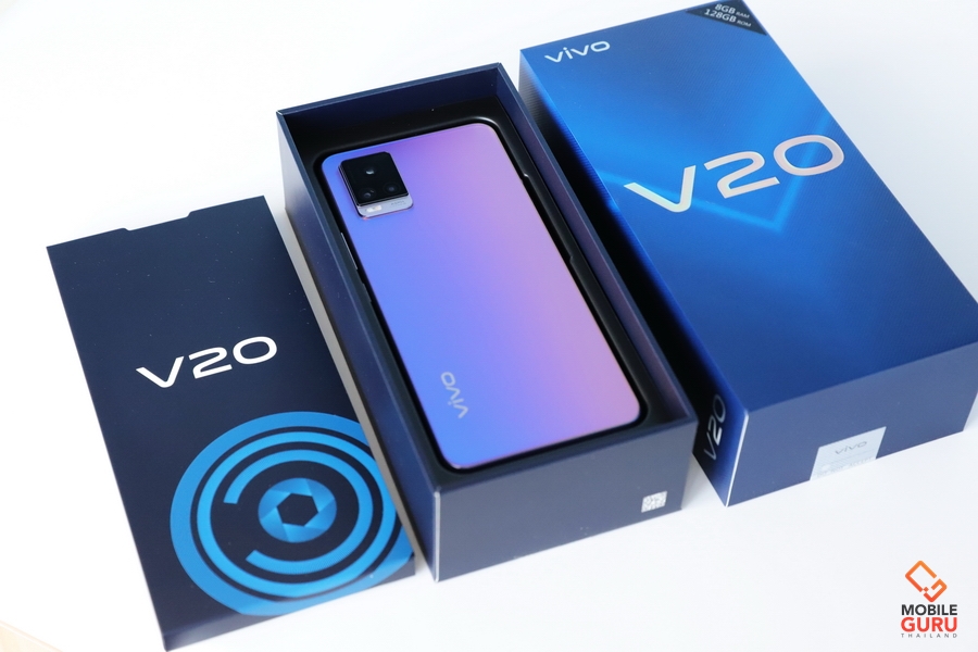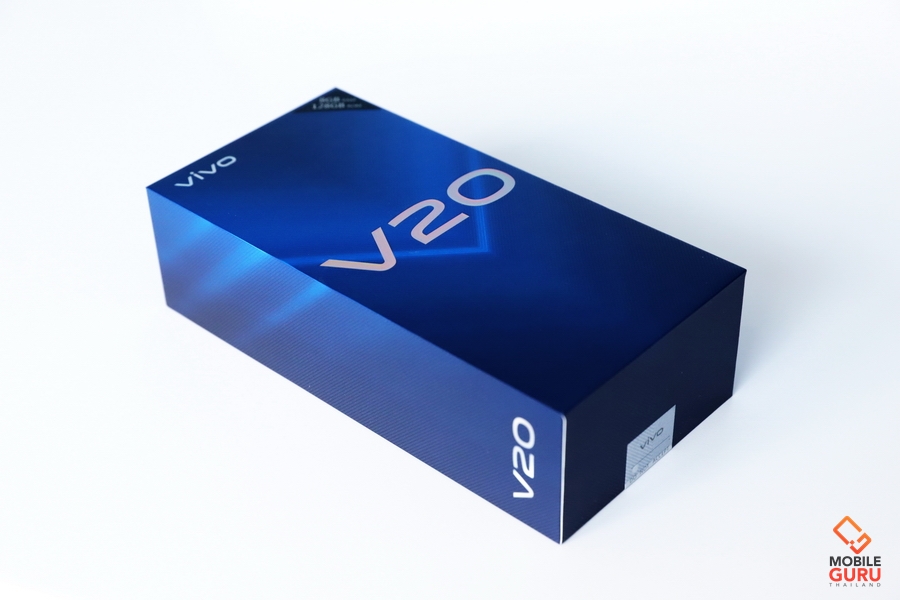 Vivo V20 มาพร้อมกล่องที่ดูพรีเมี่ยมเหมือนรุ่นพี่ อุปกรณ์ในกล่องจะมี ตัวเครื่อง, อะแดปเตอร์ พร้อมสาย USB Type-C, หูฟังแบบ Earbud, เคสใส, เข็มจิ้มซิม และคู่มือ