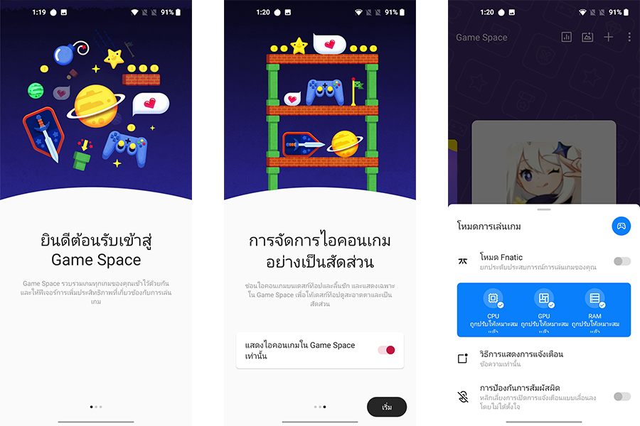เป็นอีกส่วนที่ถูกปรับปรุงใหม่บน OygenOS 11 สำหรับ Game Space โหมดสำหรับเล่นเกมโดยเฉพาะของวันพลัส ที่ร่วมมือกับค่ายเกม E-sport ชื่อดัง Fnatic ในการพัฒนา ซึ่งการอัปเกรดในครั้งนี้มีการเพิ่มลูกเล่นป็อปอัปดิสเพลย์ให้ผู้ใช้งานสามารถเรียกหน้าต่างข้อมูลตัวเครื่องได้ทันที เพียงแค่สไลด์ที่ขอบหน้าจอด้านขวาลงมา แถมยังสามารถเข้าใช้งานและอัปเดทโซเชียลมีเดียจากตรงนี้ได้ทันทีโดยที่ไม่ต้องออกจากหน้าต่างเกมเลย น่าจะถูกใจคอเกมแน่นอน ซึ่งปกติเราจะต้องกดสลับหน้าต่างไป-มา และบางครั้งพอกดกลับมาที่หน้าต่างเกม ตัวเกมก็ถูกรีสตาร์ทใหม่ ทำให้มีหัวร้อนกันบ้างล่ะ แต่คราวนี้หัวเย็นได้แล้วนะ