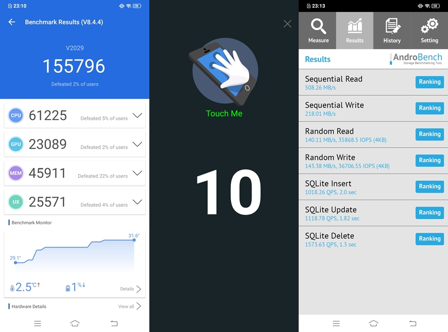 ทดสอบด้วยแอปพลิเคชัน AnTuTu Benchmark ทำไปได้ 155,796 คะแนน ทดสอบ MultiTouch รองรับ 10 จุด ทดสอบด้วยแอปพลิเคชัน AndroBench ทำความเร็ว Storage ในการอ่านอยู่ที่ 508.26 MB/s และการเขียน 218.1 MB/s (UFS 2.1) รองรับ DRM L1 สามารถรับชม Netflix HD ทดสอบสัญญาณ GPS จับสัญญาณได้รวดเร็ว Vivo Y20s กับแบตเตอรี่ความจุ 5,000 mAh รองรับชาร์จเร็ว 18W FlashCharge