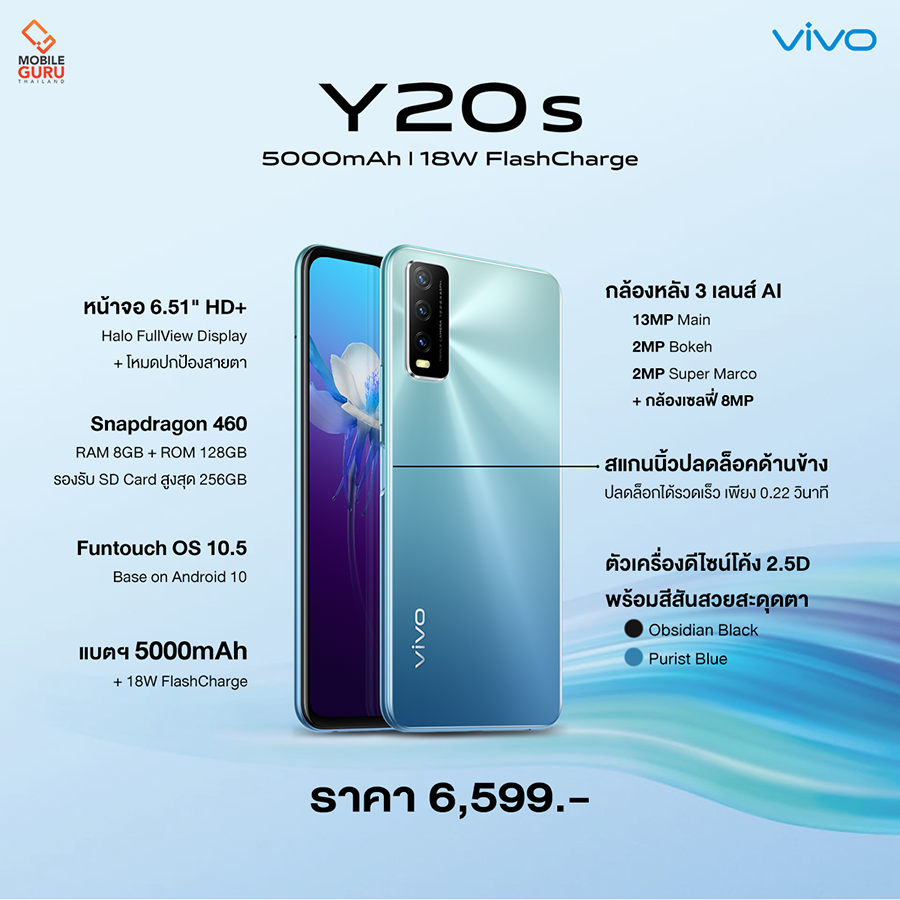 Vivo Y20s เป็นรุ่นอัปเกรดของ Vivo Y20 ที่วางจำหน่ายไปก่อนหน้านี้ มาพร้อมการอัพเกรดในส่วนของรายละเอียดสเปคต่างๆ ทั้งในส่วนของ RAM/ROM ที่จุใจยิ่งขึ้น พร้อมแบตเตอรี่ความจุสูง 5,000 mAh และรองรับชาร์จเร็ว 18W สามารถชาร์จได้ 70% ในเวลาเพียง 69 นาที และวัสดุฝาหลังแบบผิวด้าน ช่วยให้เป็นรอยนิ้วมือยากยิ่งขึ้น และดูหรูหรากว่าที่เคย เรียกได้ว่าเป็นเทรนด์ใหม่ในช่วงนี้เลยครับ ก็มีนำมาใช้ในรุ่นนี้ด้วย