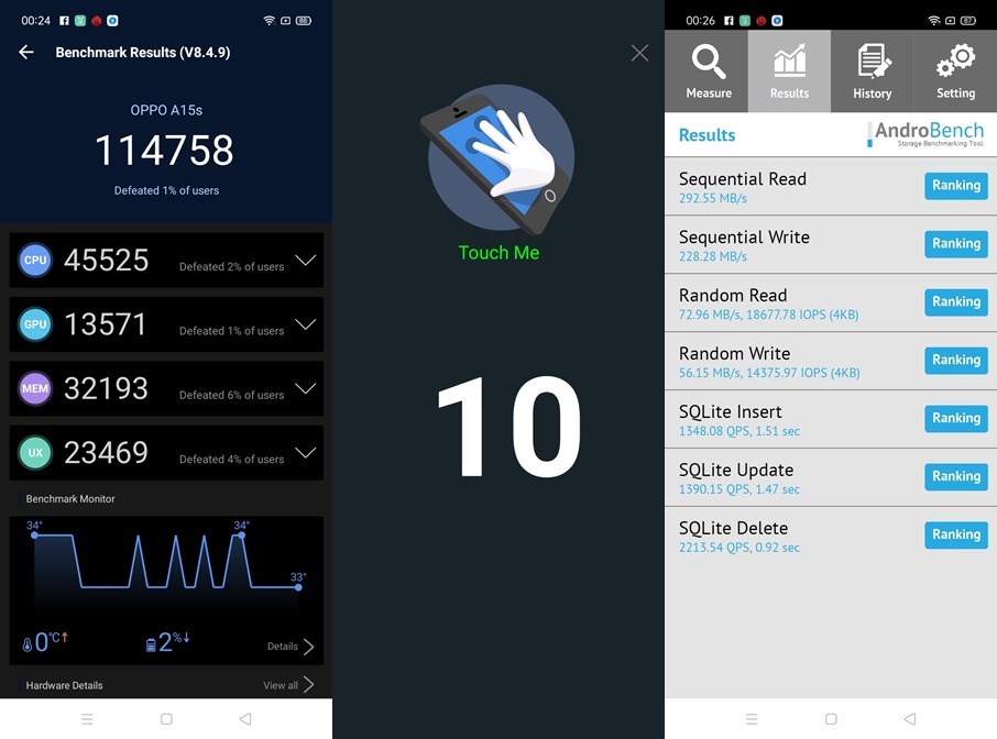 - ทดสอบด้วยแอปพลิเคชัน AndroBench ทำความเร็ว Storage ในการอ่านอยู่ที่ 292.55 MB/s และการเขียน 228.28 MB/s