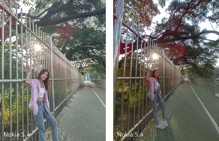 Nokia 5.4 มาพร้อมกล้องหลังสำหรับการถ่ายภาพแบบ Quad Camera ประกอบด้วย ประกอบด้วย กล้องหลักความละเอียด 48 ล้านพิกเซล, กล้อง Ultrawide ความละเอียด 5 ล้านพิกเซล, กล้อง Macro ความละเอียด 2 ล้านพิกเซล และกล้อง Depth ความละเอียด 2 ล้านพิกเซล พร้อมวางไฟแฟลช LED ในตัว ส่วนกล้องหน้าเป็นกล้องแบบเจาะรู ความละเอียด 16 ล้านพิกเซล มีลูกเล่นให้เลือกเล่นได้สนุก ๆ ประมาณหนึ่ง ส่วนหน้าตาของการใช้งานกล้องเรียบง่าย แน่นอนว่าจะไม่เจอปัญหาการหาปุ่ม (ใด ๆ) ไม่เจอค่ะ ส่วนภาพจะถูกเก็บไว้ที่ Google Photo โดยอัตโนมัติเลย สำหรับคนที่ปกติใช้งาน Google Photo ในการเก็บไฟล์ภาพอยู่แล้วก็คือสะดวกมาก ๆ