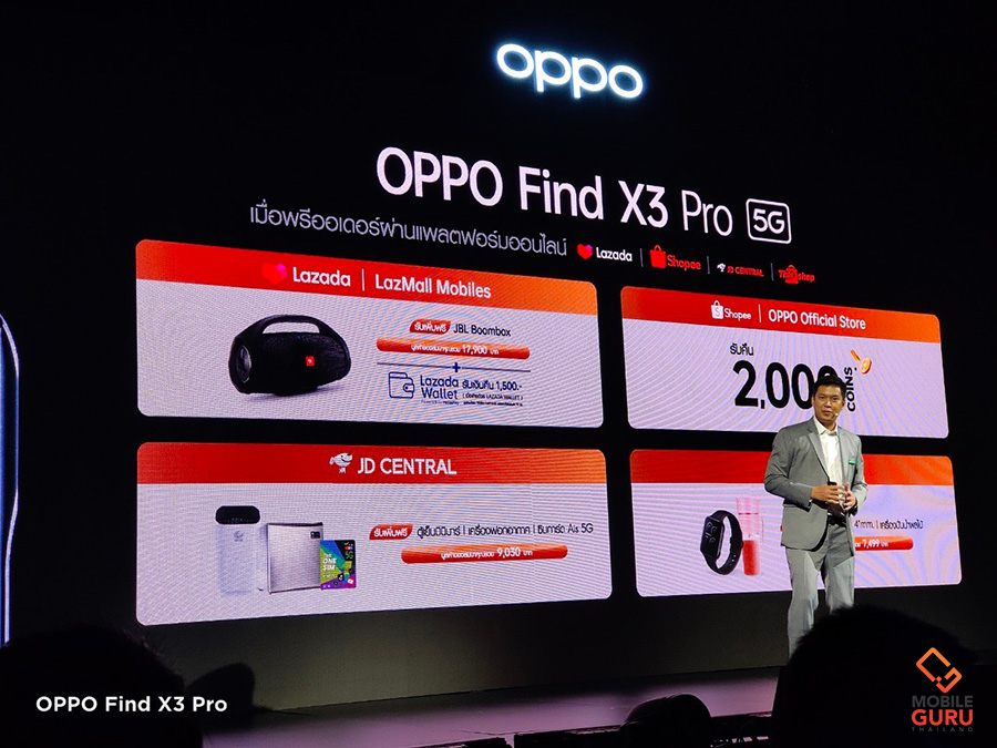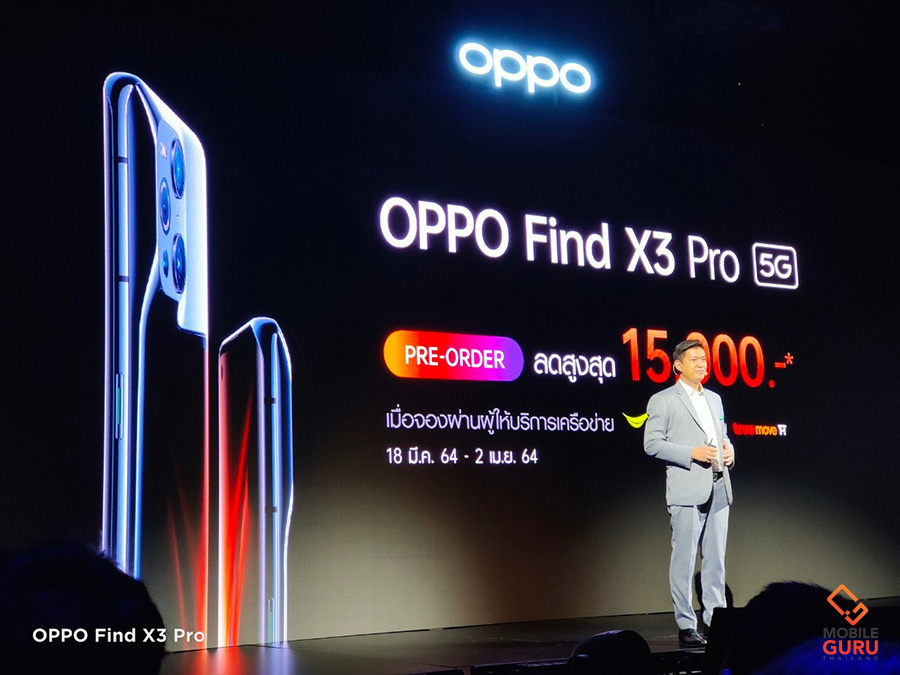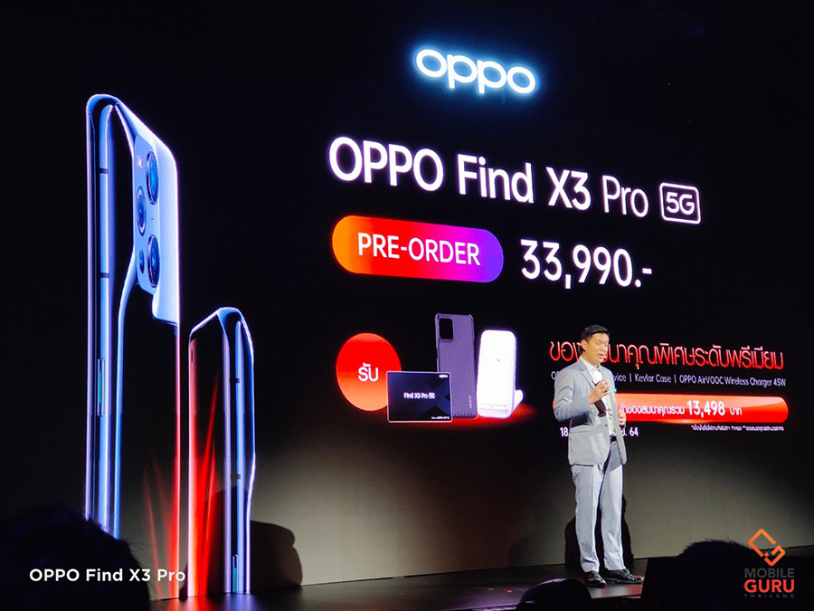 รองรับ 5G Dual Mode Dual SIM ใช้โมเดม Snapdragon X60 รองรับคลื่นความถี่ 13 แบนด์ทั้ง SA และ NSA ดีไซน์ที่สวยงามโดดเด่น วัสดุ และงานประกอบคุณภาพสูง เป็นสมาร์ทโฟนระดับเรือธง ที่บาง และเบามาก หน้าจอสวยงาม ความสว่างสูง รองรับการแสดงผล 10-bit Colors สเปคแรงที่สุดในตอนนี้ Snapdragon 888, RAM 12GB LPDDR5, ROM 256GB UFS 3.1 ลำโพงคู่ รองรับระบบเสียง Dolby Atmos กล้อง 4 เลนส์ คุณภาพสูง กล้องหลักคู่เซ็นเซอร์ Sony IMX766 ความละเอียด 50MP + 50MP พร้อมลูกเล่นการถ่ายภาพล้ำสมัย Microlens 60X ในโหมด Microscope (กล้องจุลทรรศน์) รองรับการบันทึก 10-bit Colors กล้องหน้าถ่าย Selfie สวยมากๆ แบตเตอรี่ความจุ 4,500 mAh รองรับชาร์จเร็ว 65W SuperVOOC Flash Charge ชาร์จไร้สาย 30W AirVOOC Wireless Charge และสามารถชาร์จให้กับเครื่องอื่นด้วย 10W Reverse Wireless Charging แบตเตอรี่อึดดีมาก ใช้งานได้ยาวนาน OPPO Find X3 Pro 5G สมาร์ทโฟนแฟล็กชิพที่สุดแห่งพันล้านสี วางจำหน่ายในราคา 33,990 บาท พร้อมเปิดให้ พรีออเดอร์แล้วตั้งแต่วันนี้ - 2 เมษายน 2564 รับฟรี! OPPO AirVOOC Wireless Charger 45W, KEVLAR Case และ Premium Card ที่มาพร้อมสิทธิรับประกัน International warranty service ซ่อมฟรีทั้งในและต่างประเทศ, รับความจุของ OPPO Cloud Service เพิ่มเป็น 1TB ในจำนวนจำกัด และสิทธิรับประกันตัวเครื่องถึง 2 ปี มูลค่ารวม 13,498 บาท