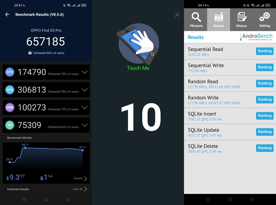 ทดสอบด้วยแอปพลิเคชัน AnTuTu Benchmark ทำไปได้ 657,185 คะแนน ทดสอบ MultiTouch รองรับ 10 จุด ทดสอบด้วยแอปพลิเคชัน AndroBench ทำความเร็ว Storage ในการอ่านอยู่ที่ 1656.21 MB/s และการเขียน 732.56 MB/s (UFS 3.1) รองรับ DRM L1 สามารถรับชม Netflix HD ทดสอบสัญญาณ GPS จับสัญญาณได้รวดเร็วมาก OPPO AirVOOC Wireless Charger 45W