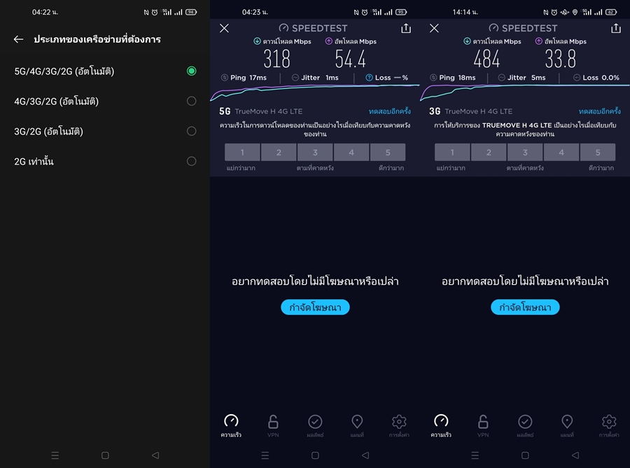 OPPO Find X3 Pro 5G รองรับสัญญาณ 5G ทั้ง 2 ซิมเลยครับ สามารถใช้งาน 5G ได้ครอบคลุมตามที่ผู้ให้บริการเครือข่ายรองรับ จากการทดสอบใช้งาน 5G จากแถวสยามไปจนถึงพระราม 2 สามารถรับสัญญาณได้ปกติ และใช้งานได้อย่างราบรื่น ผมได้ทดสอบสัญญาณที่ในห้องนอนผมเอง ที่พระราม 2 ซอย 60/1 และที่ตึก President Tower ชิดลม บริเวณชั้น 7 ผลที่ออกมาน่าพอใจมากๆ เลยครับ