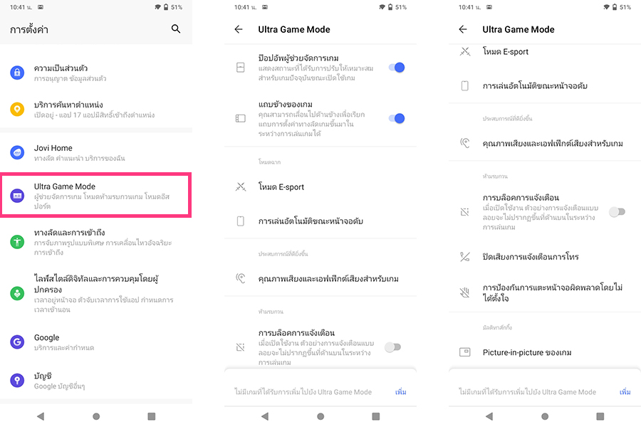 - Ultra game mode เป็นซอฟต์แวร์ที่จะช่วยให้เราสามารถจัดการสิ่ง "รบกวน" ที่อาจเกิดขึ้นขณะเล่นเกมได้เช่น ข้อความแจ้งเตือน, ข้อความทั่วไป, สายเรียกเข้า เราสามรถเลือกปิดกั้นหรือเปลี่ยนรูปแบบการแจ้งเตือนได้ หรือแม้แต่การตอบข้อความขณะเล่นเกม ก็สามารถทำได้ผ่านลูกเล่น PiP (Picture in Picture) โดยจะมีหน้าต่างแอปพลิเคชั่นที่เราจะใช้ขึ้นในรูปแบบกรอบภาพ ซึ่งสามารถเคลื่อนย้าย-ขยายเข้าออกได้ตามต้องการ ก็ถือว่าเป็นซอฟต์แวร์อำนวยความสะดวกตอนเล่นเกมได้ดีที่เดียวครับ