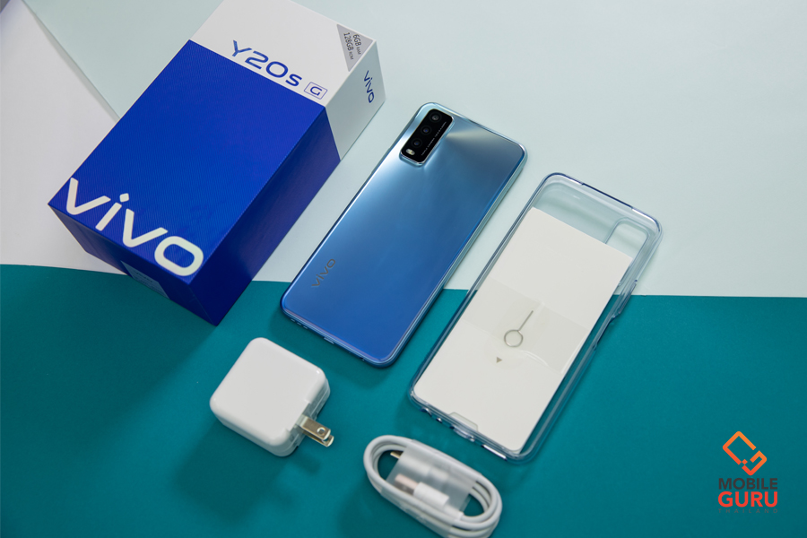 มาเริ่มกันด้วยการแกะกล่อง Vivo V20s [G] กันครับ สำหรับกล่องของ Y20sG ยังคงมาใช้โทนสีสองสีระหว่างฟ้ากับขาวตัดกันเหมือนกับ Y Series รุ่นอื่น ๆ ในขณะที่ด้านหน้ามีชื่อรุ่น "Y20sG" ชัดเจน และเมื่อเปิดกล่องขึ้นมาก็จะพบกับอุปกรณ์ใช้งานเริ่มต้นที่ทางวีโว่ใส่มาให้ดังนี้