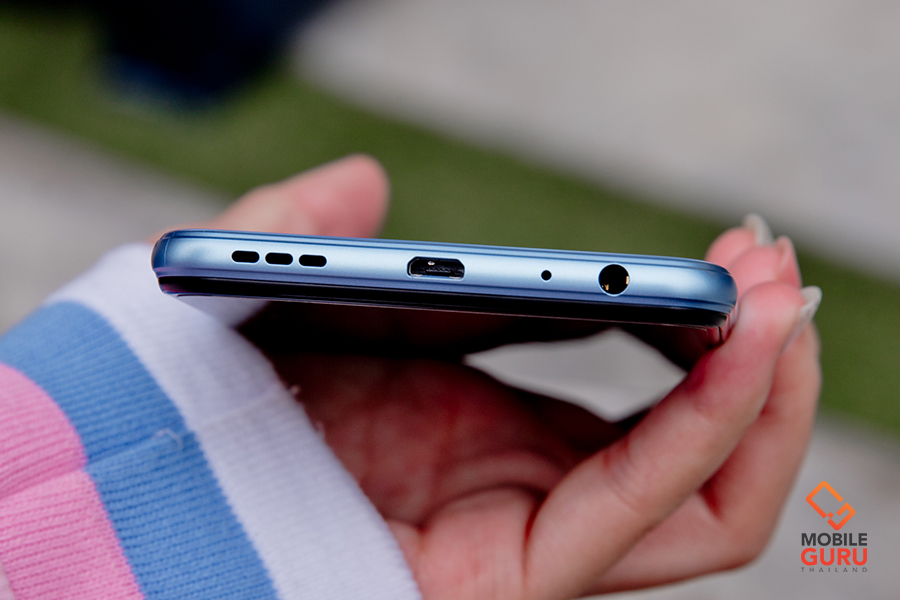 ด้านล่างตัวเครื่อง มีพอร์ตเชื่อมต่อ MicroUSB 2.0, ไมโครโฟน, ลำโพงเสียงตัวเครื่อง และรูเสียบชุดหูฟังขนาด 3.5 มิลลิเมตร