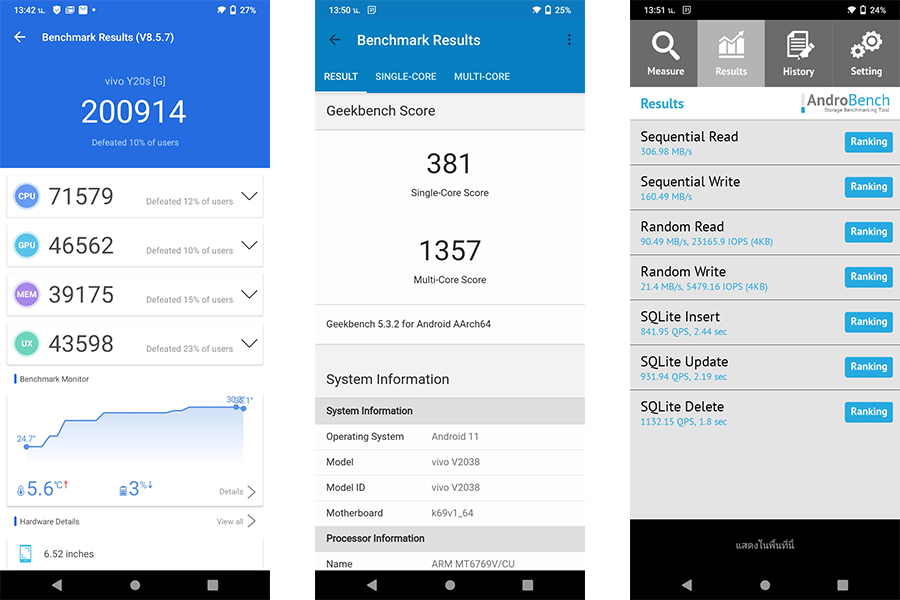 - ทดสอบประสิทธิภาพการเขียน-อ่าน หน่วยความจำ (ROM, eMMC 5.1) ได้ค่าการอ่าน 306.98 MB/s และค่าการเขียน 160.49 MB/s