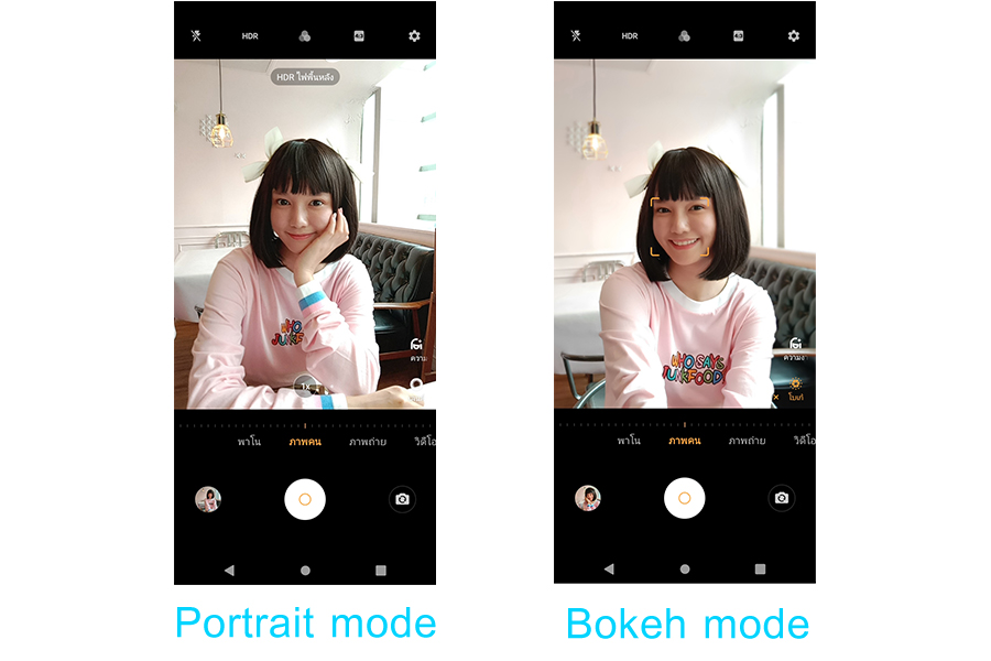 โดยโหมดถ่ายภาพบุคคล จะเป็นโหมดอัตโนมัติที่พอปัดเข้าสู่โหมดนี้ก็สามารถกดถ่ายได้ทันที ซึ่งตัวซอฟต์แวร์กล้องจะนำภาพไปโปรเซสเพื่อปรับแต่งละลายพื้นหลังและโทนสีให้ออกมาเหมาะสมและสวยที่สุดเท่าที่จะทำได้ ส่วนอีกโหมดคือ "Bokeh" โหมดนี้จะเป็นโหมดที่เปิดอิสระให้เราเลือกปรับค่ารูรับแสงของกล้องเองได้ ทำให้เราเลือกการละลายพื้นหลังได้ตามชอบ และภาพถ่ายที่ถ่ายด้วยโหมดนี้จะสามารถนำไปปรับการละลายในภายหลังเองได้ด้วย ซึ่งนี้คือความแตกต่างของสองโหมดนี้ครับ ลองไปดูภาพตัวอย่างกัน