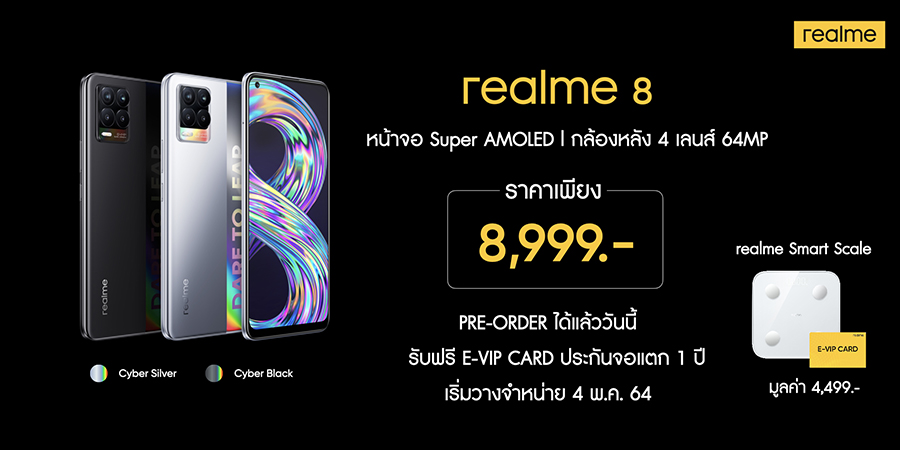 realme 8 5G และ realme 8 เริ่มเปิดให้ Pre-order แล้ววันนี้ - 3 พฤษภาคม 2564 ที่ realme Brand Shop และร้านค้าตัวแทนจำหน่าย Banana, BKK, Cyborg Kong, CSC, TG Fone, Jaymart และ IT City ทั่วประเทศ รวมทั้งช่องทางออนไลน์ Shopee, Lazada, Thisshop, JD Central และช่องทางโอเปอเรเตอร์ AIS, Truemove H และ Dtac (ราคาพิเศษ เริ่มต้นเพียง 2,489 บาทเท่านั้น*) พร้อมรับฟรีของสมนาคุณพิเศษ realme Smart Scale และ E-VIP Card ประกันจอแตก 1 ปี มูลค่ารวม 4,499 บาท และจะวางจำหน่ายอย่างเป็นทางการตั้งแต่วันที่ 4 พฤษภาคม 2564 เป็นต้นไป