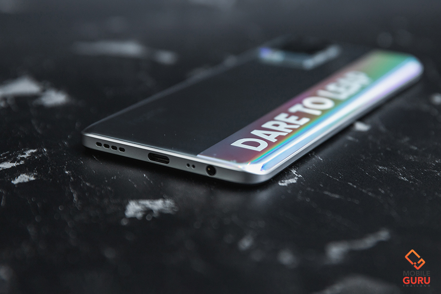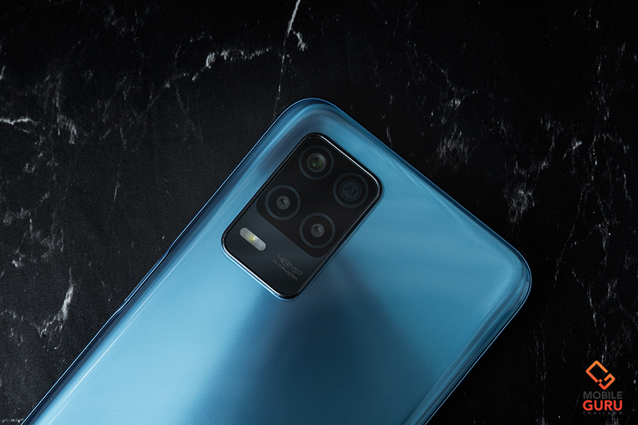 โดยฝาหลังของตัวเครื่องยังคงมีโลโก้ realme วางอยู่ในตำแหน่งด้านล่างซ้ายเช่นเคย ทำให้เหมือนกับเป็นจุดยุทศาสตร์ เป็นภาพจำของแบรนด์ไปซะแล้ว มาพร้อมกล้องหลัง 3 เลนส์ 48MP Nightscape Camera วางอยู่ในตำแหน่งด้านบนซ้ายของฝาหลัง ประกอบด้วย เลนส์หลักความละเอียด 48 ล้านพิกเซล ค่ารูรับแสงกว้าง f/1.8, เลนส์ B&W Portrait ความละเอียด 2 ล้านพิกเซล ค่ารูรับแสงกว้าง f/2.4 และเลนส์ Macro ความละเอียด 2 ล้านพิกเซล ค่ารูรับแสงกว้าง f/2.4 พร้อมไฟแฟลช LED ซึ่งโมดูลสำหรับวางกล้องนี้ จะนูนออกมาจากฝาหลัง ใครที่ชอบใช้แบบไม่ใส่เคสอาจจะต้องระมัดระวังกันหน่อยค่ะ ส่วนคนที่ใช้งานแบบใส่เคสก็หายห่วงไปได้ระดับหนึ่งในกรณีเครื่องตกหรือเลนส์ครูดกับขอบโต๊ะ เพราะเคสที่แถมมาให้มีการดีไซน์ให้ขอบนูนขึ้นมาเสมอกับโมดูลกล้องของโทรศัพท์พอดีเลยค่ะ
