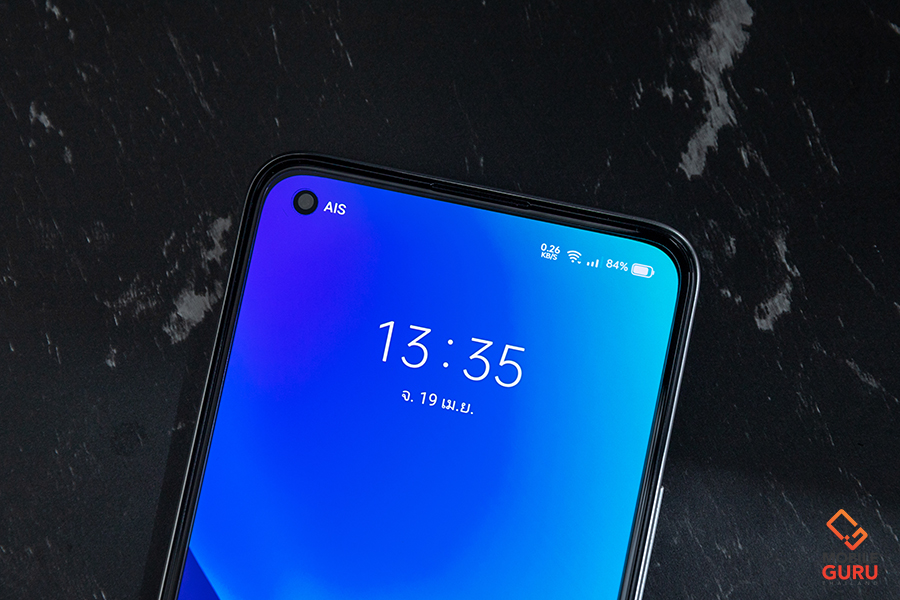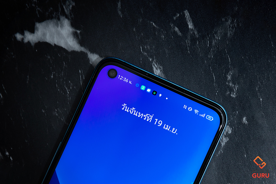 ด้านหน้าตัวเครื่องบริเวณมุมบนซ้าย วางกล้องหน้าแบบเจาะรู 16MP In-display Selfie ความละเอียด 16 ล้านพิกเซล ค่ารูรับแสงกว้าง f/2.45 ซึ่งขนาดของรูกล้องจะเล็กกว่าในรุ่น realme 8 5G เล็กน้อยค่ะ และเหนือขึ้นไปบริเวณขอบจอเป็นลำโพงเสียงสนทนา ขอบจอค่อนข้างบางทั้ง 4 ด้าน โดยที่ขอบด้านล่างจะหนากว่าด้านอื่น ๆ