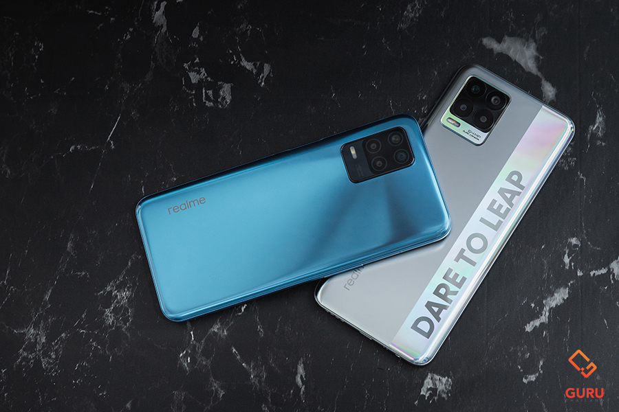 ด้านหลังของตัวเครื่องบริเวณมุมบนด้านซ้าย ติดตั้งโมดูลทรงสี่เหลี่ยมสำหรับวางกล้องหลัง 4 เลนส์ 64MP AI Quad Camera ประกอบด้วย เลนส์หลักความละเอียด 64 ล้านพิกเซล ค่ารูรับแสงกว้าง f/1.79, เลนส์ Ultra Wide-angle ความละเอียด 8 ล้านพิกเซล ค่ารูรับแสงกว้าง f/2.25, เลนส์ Macro ความละเอียด 2 ล้านพิกเซล ค่ารูรับแสงกว้าง f/2.4 และเลนส์ B&W Portrait ความละเอียด 2 ล้านพิกเซล ค่ารูรับแสงกว้าง f/2.4 พร้อมไฟแฟลช LED ด้านล่างซ้ายมีโลโก้ realme วางขนานไปกับสโลแกน DARE TO LEAP ที่วางอยู่ทางฝั่งขวา