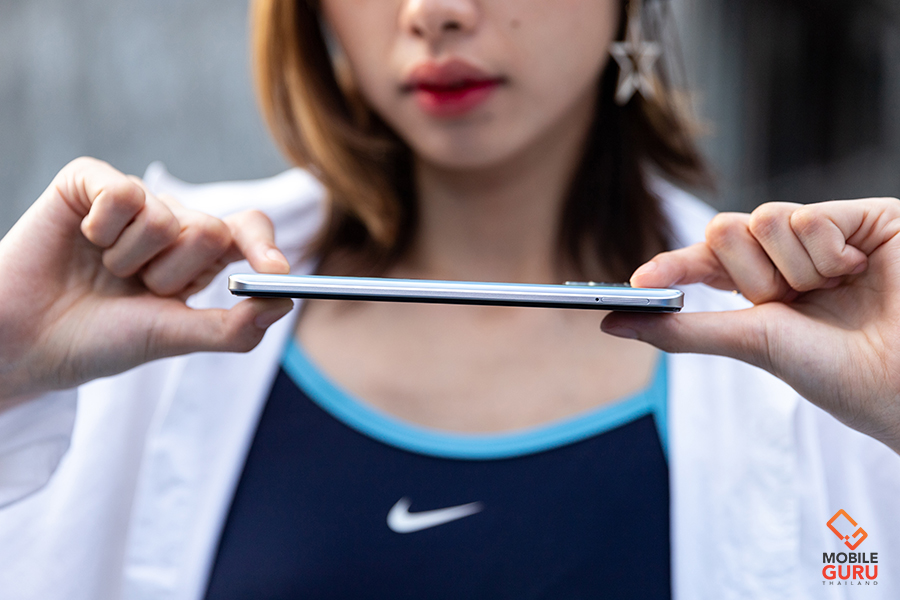 ด้านขวาของตัวเครื่องมีปุ่ม Power สำหรับเปิด-ปิดตัวเครื่องและพักการใช้งานหน้าจอ พร้อมทั้งออกแบบมาให้แบนราบเพื่อใช้เป็นตำแหน่งสำหรับสแกนลายนิ้วมือด้วย โดยสามารสแกนปลดล็อกได้อย่างแม่นยำ ปลอดภัย และรวดเร็วเพียง 0.3 วินาทีเท่านั้น ส่วนทางด้านซ้ายของตัวเครื่องมีถาดสำหรับใส่ซิมการ์ดแบบ 3-Card Slot รองรับ Nano-SIM 2 ช่อง และอีก 1 ช่องสำหรับเพิ่มพื้นที่เก็บข้อมูลด้วย MicroSD Card ได้สูงสุดถึง 1TB ขยับลงมาด้านล่างจะเป็นปุ่มสำหรับปรับเพิ่ม-ลดระดับเสียง (Volume)