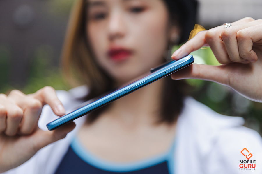 ด้านขวาของตัวเครื่องมีปุ่มสำหรับปรับเพิ่ม-ลดระดับเสียง (Volume) ถัดลงมาเป็นปุ่ม Power สำหรับเปิด-ปิดตัวเครื่องและพักการใช้งานหน้าจอ ส่วนทางด้านซ้ายของตัวเครื่องมีถาดสำหรับใส่ซิมการ์ดแบบ 3-Card Slot รองรับ Nano-SIM 2 ช่อง และอีก 1 ช่องสำหรับเพิ่มพื้นที่เก็บข้อมูลด้วย MicroSD Card ได้สูงสุดถึง 256GB