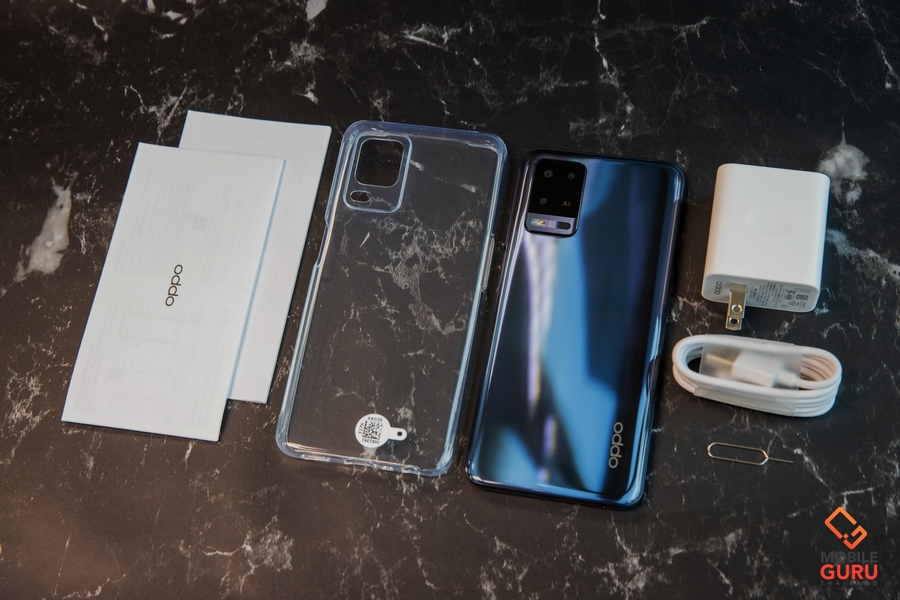 OPPO A54 อุปกรณ์ในกล่องจะมี ตัวเครื่อง, อะแดปเตอร์, สาย microUSB 2.0, เคสใส, เข็มจิ้มซิม และคู่มือ (ไม่มีหูฟังมาให้นะครับ)