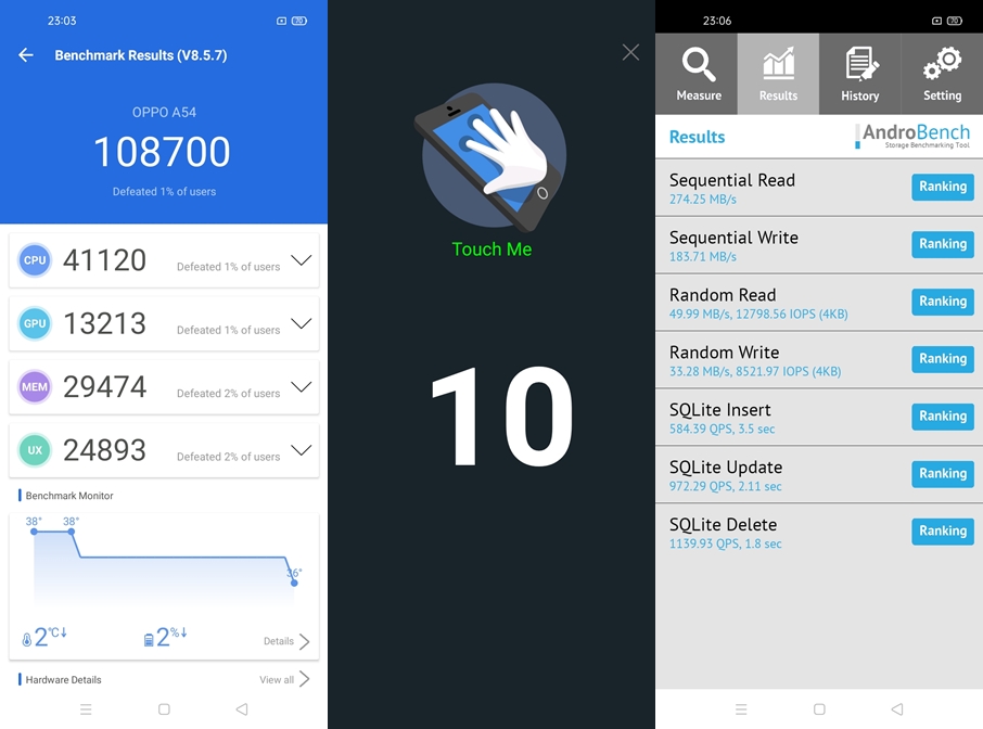 - ทดสอบด้วยแอปพลิเคชัน AndroBench ทำความเร็ว Storage ในการอ่านอยู่ที่ 274.25 MB/s และการเขียน 183.71 MB/s