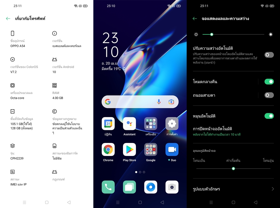 OPPO A54 ทำงานบน Android 10 ครอบทับด้วย ColorOS 7.2 มาพร้อมสเปค Mediatek Helio P35, GPU PowerVR GE8320, RAM 4GB, ROM 128GB รองรับ microSDXC สูงสุด 256GB, ในส่วนของการใช้งานทำได้ดี และสวยงาม ความเร็วและความลื่นไหลอยู่ในระดับกลางๆตามสเปค แต่ลูกเล่นต่างๆใน ColorOS 7.2 จัดมาให้ครบถ้วน ช่วยให้สมาร์ทโฟนรุ่นนี้น่าใช้ไม่เบาเลยครับ ไม่ว่าจะเป็น Dark Mode, Smart Gesture, ฟีเจอร์โคลนแอปพลิเคชั่น, App Split-Screen การแบ่งหน้าจอเป็น 2 ส่วน เป็นสมาร์ทโฟนระดับกลาง ที่มอบประสบการณ์การใช้งานที่ครบถ้วนทีเดียว