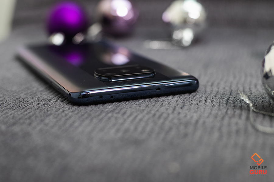 POCO X3 Pro มีให้เลือกด้วยกัน 3 สี ได้แก่ สีดำ Phantom Black, สีฟ้า Frost Blue และสีบรอนซ์ Metal Bronze ครั้งแรกที่ได้จับต้องบอกตามตรงว่าสิ่งที่ทำให้สะดุดตาทันทีเลยก็คือการเล่นสีแบบทูโทนของฝาหลังที่ทำได้สวยงามมาก! โดยเฉพาะสีดำ Phantom Black ที่เราได้นำมารีวิวในวันนี้จะออกไปทางสีดำเหลือบน้ำตาลอมม่วง สามารถเล่นกับแสงในมุมต่าง ๆ วัสดุของฝาหลังทำจากพลาสติกแข็งที่ทนทาน ไม่ก้องแก้ง ด้านข้างเป็นผิวสัมผัสด้าน คาดด้วยผิวเงาตรงกลาง และพิมพ์ทับด้วยโลโก้ของแบรนด์ที่ด้านล่าง ซึ่งค่อนข้างติดรอยนิ้วมือพอสมควรเลยค่ะ