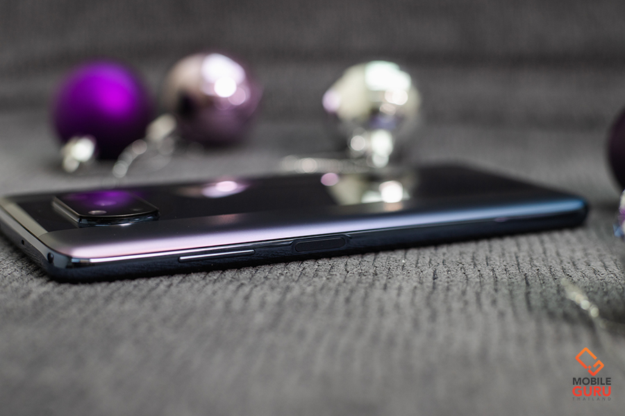 สำหรับด้านข้าง ด้านขวามือจะเป็นปุ่มเพิ่ม/ลดระดับเสียง และปุ่ม Power ซึ่งใช้เป็นเซนเซอร์สแกนลายนิ้วมือในตัวด้วย ส่วนด้านซ้ายมือจะเป็นช่องสำหรับใส่ซิมการ์ด 2 ช่อง สามารถเลือกได้ว่าจะใส่ SIM2 หรือ การ์ดหน่วยความจำ MicroSD ซึ่งรองรับสูงสุดได้ 1 TB
