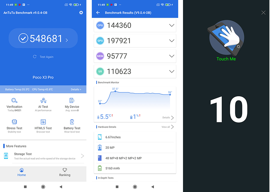 POCO X3 Pro มาพร้อมประสิทธิภาพระดับแฟลกชิป ออกแบบมาเพื่อการเล่นเกมโดยเฉพาะ ด้วยชิปประมวลผล Qualcomm Snapdragon 860 เทคโนโลยีการประมวลผล 7 นาโนเมตร ให้ความเร็ว สูงสุดถึง 2.96GHz ซึ่งเป็นหนึ่งในแพลตฟอร์มสมาร์ทโฟน 4G ที่ทรงพลังที่สุดในตอนนี้ พร้อมด้วย GPU Adreno 640 สำหรับการแสดงผลกราฟิกที่ดีขึ้น เพื่อให้สามารถเล่นเกมด้วยกราฟิกคุณภาพสูงได้อย่างลื่นไหล นอกจากนี้ยังทำงานร่วมกับ LiquidCool Technology 1.0 Plus ซึ่งเป็นเทคโนโลยีระบายความร้อนที่บรรจุท่อความร้อนทองแดงที่ขยายใหญ่ขึ้นและกราไฟท์หลายชั้น ช่วยเพิ่มความสามารถในการระบายความร้อนระหว่างเล่นเกมได้เป็นอย่างดี และเสริมแรงด้านความเร็วสัญญาณด้วยการรองรับ Wifi-6 โดยเจ้า POCO X3 Pro ได้คะแนนทดสอบผลออกมาดังนึ้ค่ะ