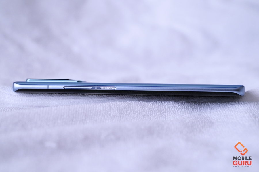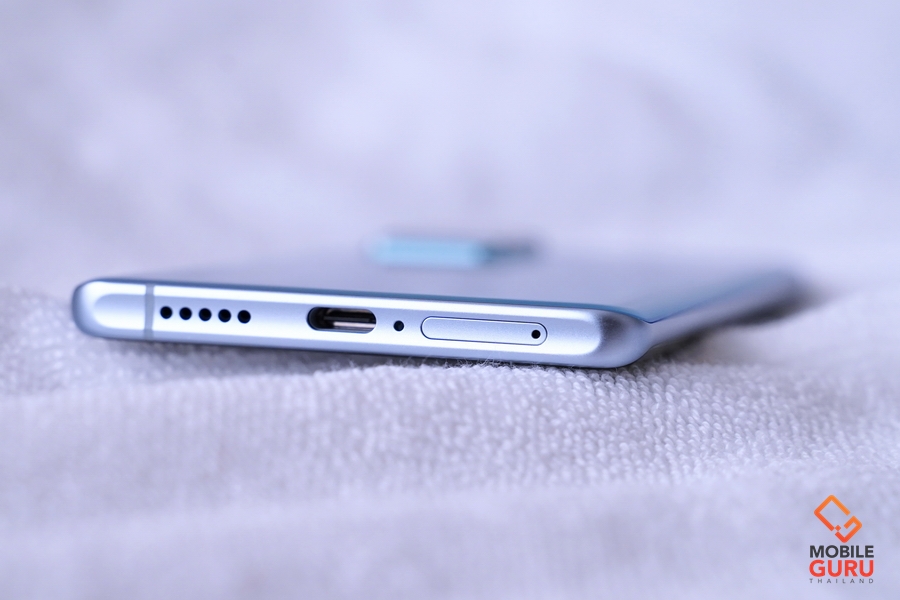 ฝาหลังเป็นกระจกเคลือบผิวด้านมีการไล่โทนที่สวยงาม และไม่เป็นรอยนิ้วมือ สำหรับสีที่ได้รับมาทดสอบจะเป็นสี Shimmer Blue ที่ให้ความรู้สึกเหมือนท้องฟ้าที่ใสกระจ่าง และมีสายรุ้งพาดผ่านในวันดีๆ ที่สดใสเลยครับ โดยแสงเงาและสีสันจะเปลี่ยนไปตามเวลาที่เราเอียงเครื่องไปมา