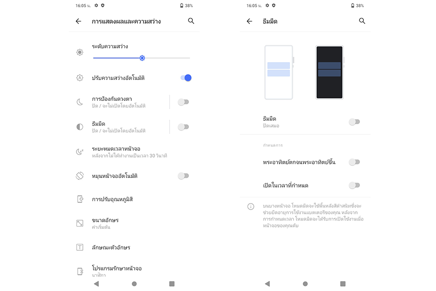 - โหมดกลางคืน (Dark mode) : โหมดสำหรับเปลี่ยนธีมสี UI ให้กลายเป็นพื้นสีดำ เหมาะสำหรับการใช้งานกลางคืน เพราะจะลดปริมาณแสงสว่างของหน้าจอลงได้ ทำให้ไม่ไปส่องแย้งตาคนรอบข้าง