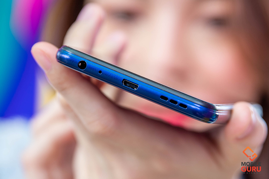 ด้านล่างตัวเครื่อง จะเป็นตำแหน่งของรูเสียบชุดหูฟังขนาด 3.5 มิลลิเมตร, พอร์ตเชื่อมต่อแบบ MicroUSB ใช้ชาร์จไฟเข้าเครื่อง และลำโพงเสียงของตัวเครื่อง