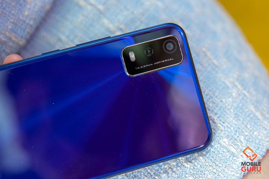 ด้านหลังตัวเครื่อง จะเป็นตำแหน่งของกล้องถ่ายรูปแบบ Single Lens ทำงานร่วมกับซอฟต์แวร์ AI Camera ความละเอียด 13MP (F2.2) และไฟแฟลช LED 1 ดวง