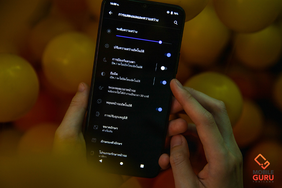 - โหมดถนอมสายตา : เมื่อเปิดโหมดนี้ตัวหน้าจอแสดงผลจะตัดการแสดงผลของแสงสีฟ้าออกไปให้ ดังนั้นโทนสีของหน้าจอจะกลายเป็นสีเหลืองนวล ช่วยถนอมสายตาและลดอันตรายจากแสงสีฟ้าที่ส่งผลต่อดวงตาลงได้