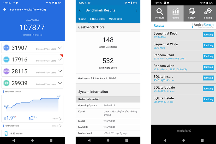 - ทดสอบประสิทธิภาพการเขียน-อ่าน หน่วยความจำ (ROM, eMMC 5.1) ได้ค่าการอ่าน 249.16 MB/s และค่าการเขียน 65.79 MB/s