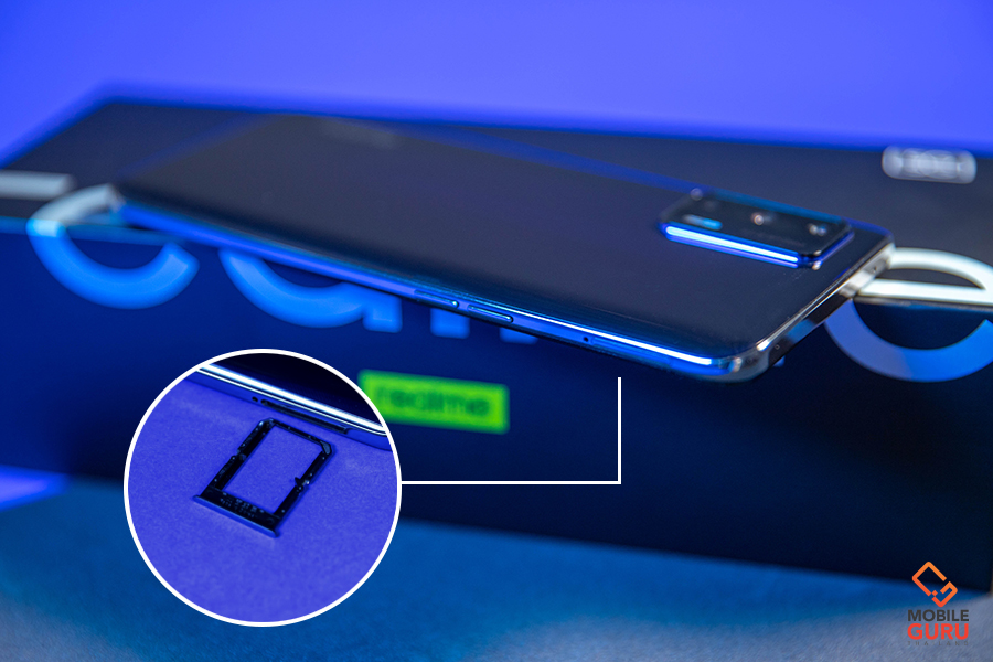 หน้าจอแสดงผล Super AMOLED ขนาด 6.43 นิ้ว ความละเอียดระดับ FHD+ (2,400 x 1,080 พิกเซล) อัตรา Refresh Rate 120Hz และ Touch Sampling Rate 360Hz อัตราส่วนจอแสดงผล 20:9 บนสัดส่วนหน้าจอต่อเครื่อง 91.7% ค่าสี 100% DCI-P3 Color Gamut และ 98% NTSC หน่วยประมวลผล CPU Snapdragon 888 5G (5mn), Octa-core, Up to 2.84GHz หน่วยประมวลผล GPU Adreno 660 หน่วยความจำ RAM 8GB (LPDDR5) หน่วยความจำ ROM 128GB (UFS 3.1) ช่องใส่ซิมการ์ด Dual-SIM รองรับซิมการ์ดแบบ Nano Sim 2 ช่อง (ไม่รองรับการเพิ่มพื้นที่ความจำภายนอก) กล้องหลัง 3 เลนส์ ประกอบด้วย เลนส์หลักความละเอียด 64MP + เลนส์ Ultra Wide-angle ความละเอียด 8MP + เลนส์ Macro ความละเอียด 2MP กล้องหน้าความละเอียด 16MP การเชื่อมต่อ -- 5G + 5G Dual Mode (SA/NSA) -- Wi-Fi 6 802.11 ax -- Bluetooth 5.2 -- GPS, GLONSS, BEIDOU, GALILEO, QZSS -- ช่องเสียบหูฟัง 3.5 มม. -- พอร์ต USB Type-C รองรับ NFC ระบบเซ็นเซอร์ Magnetic Induction Sensor, Light Sensor, Proximity Sensor, Gyro-meter, Acceleration Sensor แบตเตอรี่ 4,500 mAh รองรับชาร์จไว 65W SuperDart Charge และ OTG Reverse Charge ระบบปฎิบัติการ Android 11ครอบทับด้วย realme UI 2.0 การออกแบบ (Design)