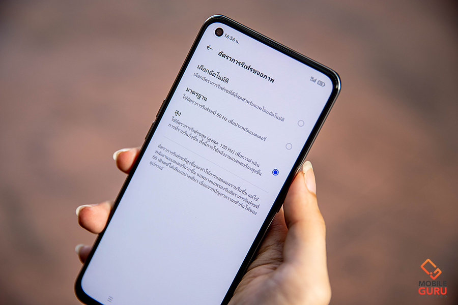 realme GT 5G มาพร้อมหน้าจอแสดงผลรองรับอัตราการรีเฟรชจอภาพสูงสุด 120Hz สามารถเลือกการตั้งค่าเป็นแบบมาตรฐาน 60Hz, อัตราการรีเฟรชสูง 120Hz หรือจะเลือกเป็นแบบอัตโนมัติเพื่อให้ระบบเลือกอัตราการรีเฟรชที่ดีที่สุดสำหรับแต่ละแอปพลิเคชันก็ได้