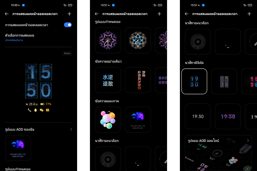 และยังมาพร้อมกับ Always-on Display ฟีเจอร์สำหรับการดูสถานะที่สำคัญ เช่น วันที่ เวลา แบตเตอรี่ และการแจ้งเตือนต่าง ๆ ได้ ในขณะที่โทรศัพท์อยู่โหมดสแตนด์บายหรือล็อกหน้าจอ โดยมีรูปแบบให้เลือกปรับแต่งความสวยงามตามความต้องการหลายแบบเลยค่ะ