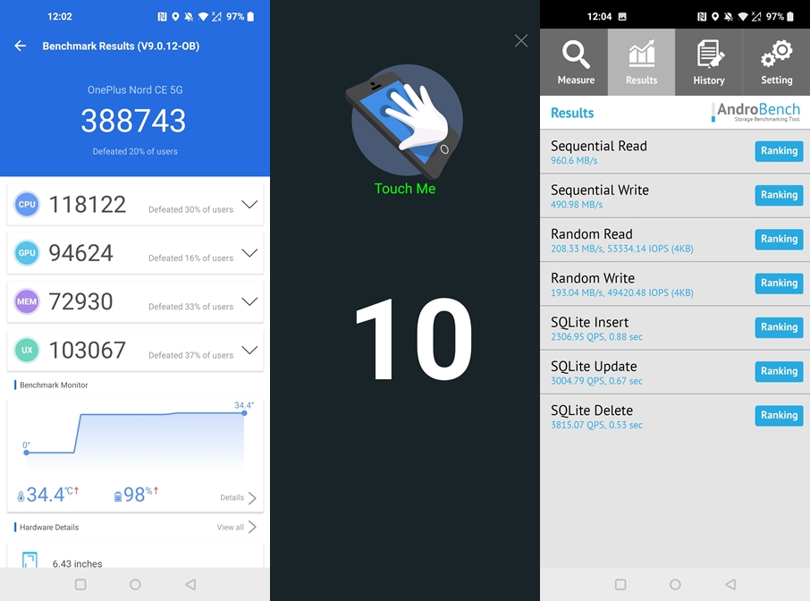 - ทดสอบด้วยแอปพลิเคชัน AndroBench ทำความเร็ว Storage ในการอ่านอยู่ที่ 960.6 MB/s และการเขียน 490.98 MB/s (UFS2.1)