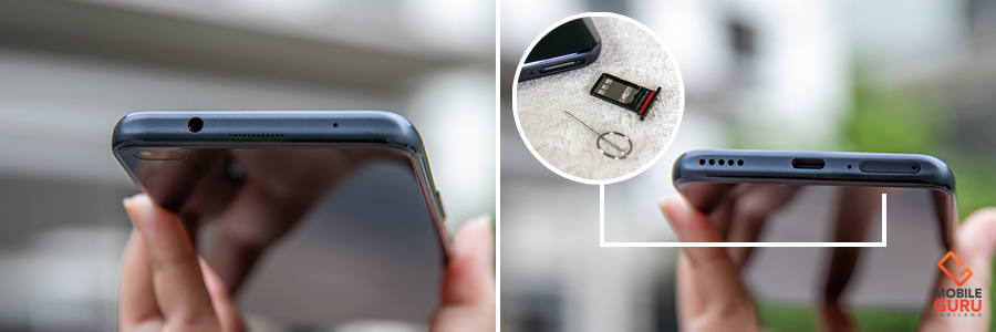 ทางด้านบนของตัวสมาร์ทโฟน จะเป็นพอร์ตสำหรับเสียบหูฟัง 3.5 มม., ลำโพงสนทนา และไมโครโฟน เลื่อนลงมาที่ด้านล่างของตัวเครื่อง จะเป็นลำโพงหลัก, พอร์ตชาร์จ USB Type-C, ไมโครโฟน และถาดสำหรับซิมการ์ดแบบ Dual SIM รองรับซิมแบบ Nano-SIM 2 ซิม