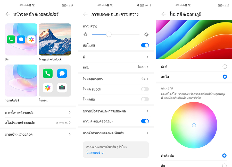 อย่างหนึ่งที่ชอบในระบบปฏิบัติการของหัวเว่ย คือสามารถปรับแต่งหน้าจอล็อกและโฮมสกรีนได้ค่อนข้างอิสระ ไม่ว่าจะเป็นธีม พื้นหลัง ไอคอน ตัวหนังสือ และขนาดข้อความต่าง ๆ เป็นต้น นอกจากนี้ยังมีโหมดการแสดงผลจอให้เลือกได้ตามการใช้งานได้อย่างเฉพาะ ไม่ว่าจะเป็น Dark mode (โหมดกลางคืน), Eye Comfort (โหมดสบายตา) และ eBook mode (โหมดอ่านหนังสือ) อีกทั้งมีโหมดสี & อุณหภูมิให้สามารถปรับโทนสีบนจอได้ตามต้องการ
