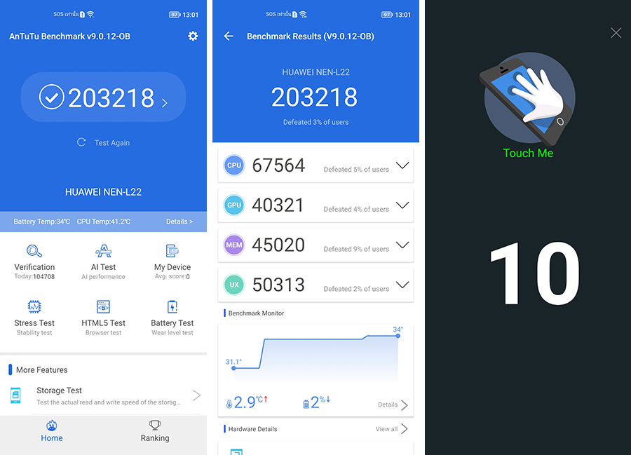 - ทดสอบด้วยแอปพลิเคชัน AnTuTu Benchmark ทำไปได้ 203,218 คะแนน