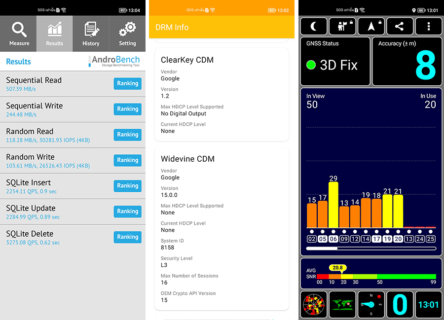 - ทดสอบการจับสัญญาณ GPS ภาคพื้นดินด้วยแอปพลิเคชัน GPS Tester พบว่าจับสัญญาณได้ 20 ดวงจาก 50 ดวง