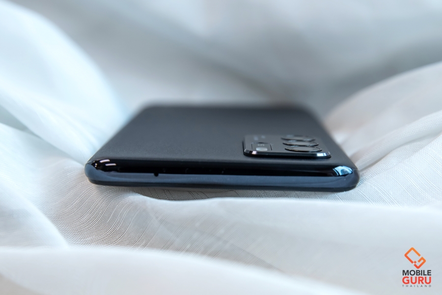 ขอบด้านข้างตัวเครื่องมันเงา ด้านบนมีไมค์ตัดเสียงรบกวน ด้านล่างมีพอร์ทหูฟัง 3.5 มม., ไมโครโฟน, USB Type-C 2.0 และลำโพง, ด้านซ้ายมีช่องใส่ซิม (รองรับ Triple Slot) และปุ่มปรับระดับเสียง ส่วนด้านขวาจะเป็นปุ่ม Power