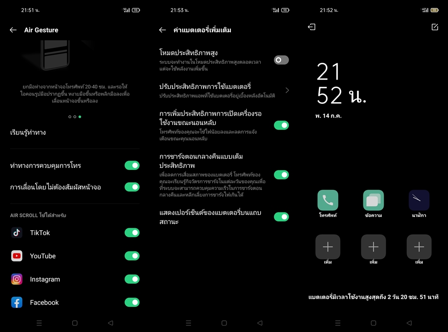 OPPO Reno6 Z 5G จัดฟีเจอร์เด่นๆเป็นตัวช่วยสำหรับอำนวยความสะดวกในการเล่นเกมมาให้ Quick Startup จะตรวจจับและเรียนรู้การเล่นเกมของเรา เมื่อเรากลับมาเล่นเกมนั้นๆ จะสามารถเริ่มเล่นเกมได้เลยโดยไม่เสียเวลาในช่วงเริ่มเกม (เปิดเกมขึ้นมา > ปัด Settings ด้านข้าง > Quick Startup) และ Game Focus Mode สามารถปิดการแจ้งเตือนทั้งหมด เหลือไว้แต่ที่จำเป็นจริงๆ เพื่อให้เวลาเล่นเกมไม่มีอะไรมาขัดจังหวะให้เสียอารมณ์ (เปิดเกมขึ้นมา > ปัด Settings ด้านข้าง > Game Focus Mode)
