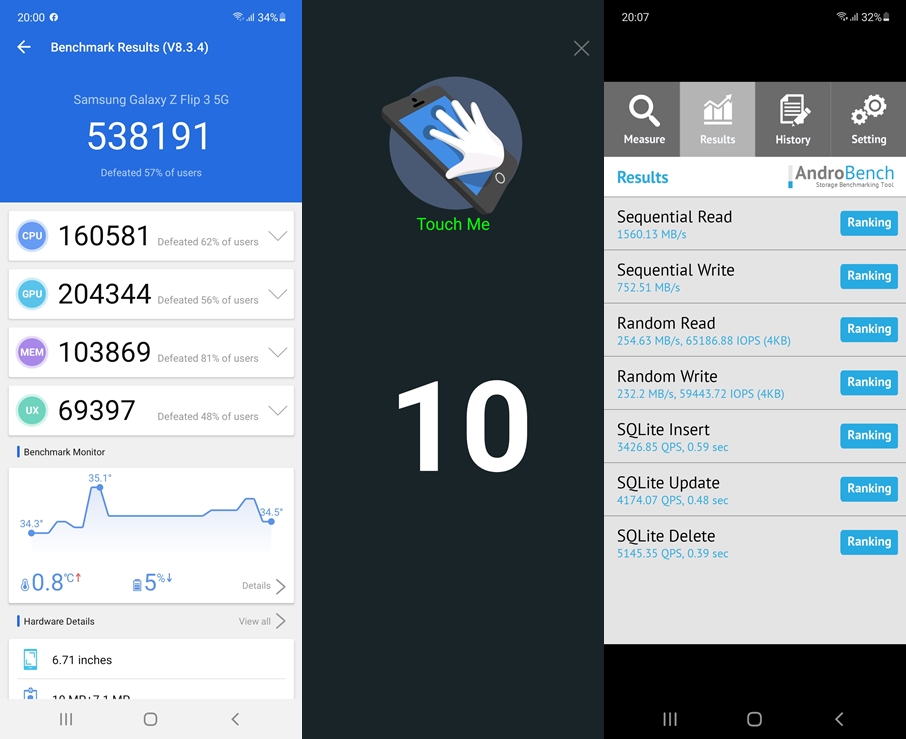 - ทดสอบด้วยแอปพลิเคชัน AndroBench ทำความเร็ว Storage ในการอ่านอยู่ที่ 1560.13 MB/s และการเขียน 752.51 MB/s (UFS3.1)