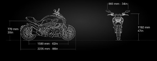 Ducati Diavel ถูกออกแบบและผลิตขึ้นตามแนวคิดความลงตัวของน้ำหนักที่เบา ให้พลังสูง ควบคุมง่าย พร้อมความสะดวกสบาย ด้วยเทคโนโลยี่เต็มคัน ทั้งเบรก ABS, DTC (Ducati Traction Control) ช่วยให้ผู้ขับขี่สามารถควบคุมการถ่ายทอดกำลังผ่านล้อหลังได้อย่างมั่นใจ มั่นคงด้วยดีไซน์ ให้พลังเหลือเฟือจากเครื่องยนต์ 162 แรงม้า กับน้ำหนักตัว 207 กก. ยางหลังขนาด 240 มม. ซีรี่ส์ใหม่สำหรับเติมเต็มให้การขับขี่ในทางโค้งทำได้อย่างง่ายดาย เสริมบุคลิกความทันสมัย ด้วยอุปกรณ์อำนวยความสะดวกอิเล็กทรอนิกส์มากมาย