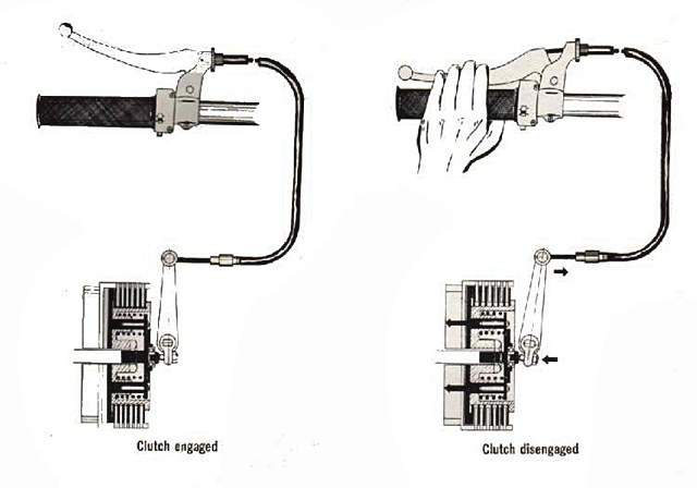 ชุดคลัตช์นี่เองทำหน้าที่ตัดการหมุนของ Flywheel ไม่ให้ส่งกำลังไปยังชุดเกียร์หรือชะลอความเร็วของชุดเพลาที่ต่อไปยังระบบเกียร์ให้ช้าลง เพื่อช่วยให้เข้าเกียร์ได้ง่ายขึ้น และลดการสึกหรอในจังหวะ "ขบ" กันของฟันเฟือง ชุดคลัตช์ควบคุมโดยก้านบังคับหรือก้านคลัตช์ที่แฮนด์ด้านซ้าย ด้วยการบีบเข้าหาตัว (ตัดกำลัง) หรือปล่อย (ต่อกำลัง) นั่นเอง