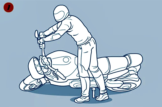 เริ่มจากเข้าไปปิดสวิตช์กุญแจก่อนเลย จากนั้นตบเกียร์เข้าจะ 1 หรือ 2 ก็ได้ และหมุนแฮนด์ให้ปลายชี้ไปทิศทางเดียวกับฝั่งที่ล้ม ถ้ารถล้มด้านซ้าย ก็หมุนปลายแฮนด์ไปทางซ้าย แต่ถ้าล้มทางขวาก็เตะขาตั้งข้างออกมา